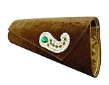 A beautiful brown color clutch/purse with velvet fabric with beautiful brooch and magnetic enclosure .It has an optional chain strap.The interior of the clutch is smooth or soft fabric.It is a bridal clutch and has a round shape.It has a one side pocket and one zipper inclosure. This is very attractive fashionable evening hand bag/clutch/purse. Size Length:5" Inch Width:11.5" Inch